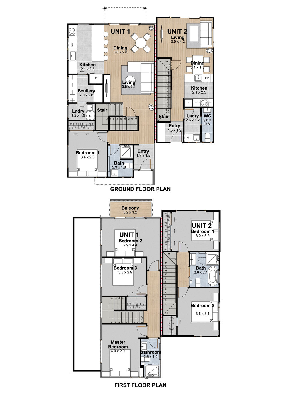 This refined duplex design blends modern minimalism with natural warmth, presenting a bold yet balanced presence. Defined by a rhythmic play of dark vertical cladding, warm timber accents, and crisp geometric forms, the exterior exudes contemporary elegance. Large windows and private balconies create strong connections to the outdoors while ensuring privacy within. Inside, the layout prioritizes functional zoning—living and entertaining spaces are positioned to maximize light, flow, and comfort, while bedrooms above offer peaceful retreat. Smart design elements like integrated storage, efficient footprints, and subtle material layering make this home both beautiful and practical. Ideal for urban or suburban infill sites, the design reflects thoughtful density with architectural clarity.
